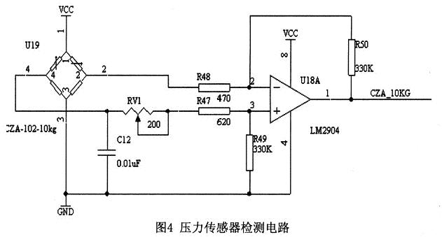 圖4為壓力傳感器的應用電路圖,該電路采用的電橋構(gòu)成測量電壓,是一種具有較高靈敏度的測量方法。無差壓時,電橋兩臂平等。差壓信號加到4個陶瓷壓敏電阻上,壓敏電阻的阻值隨差壓而變化,引起電橋失衡。電橋失衡引起電流的變化,通過運放LM2904進行電流的放大在后面接ADC0834模數(shù)轉(zhuǎn)換芯片,把模擬信號轉(zhuǎn)化為數(shù)字信號,再傳輸至CPU進行處理。