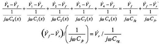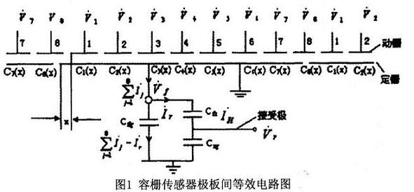 相應的信號源全部落在這些電容上,同樣,對傳感器的輸出信號無影響。如果給容柵傳感器每組發(fā)射極板上所加的發(fā)射電壓V1~V8為8路頻率、幅值相同而相鄰小極板間相位相差為π/4的正弦交變電壓,則在發(fā)射極上有電壓Vf,在接收極上有電壓Vr。應用交流電路理論及基爾霍夫電流定律,解讀圖l的等效電路,如下: