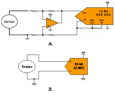 24 位Δ-Σ (B) 顯示的是一個直接連接至轉換器的傳感器。