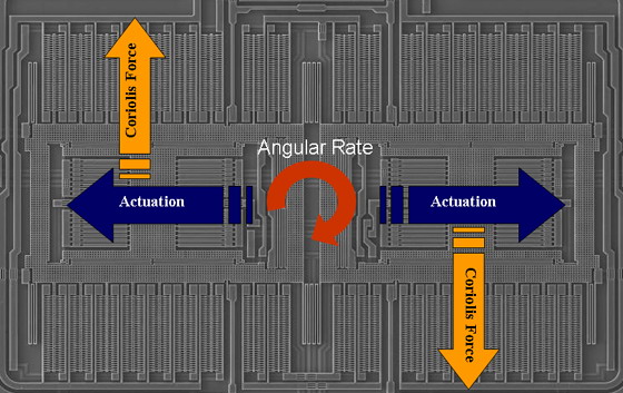 - 感應部分通過測量電容變化來測量科里奧利力在感應質點上產生的位移,這是一個穩健、可靠的技術,被成功地用于ST的MEMS產品線,能夠提供強度與施加在傳感器上的角速率成正比的模擬或數字信號。
