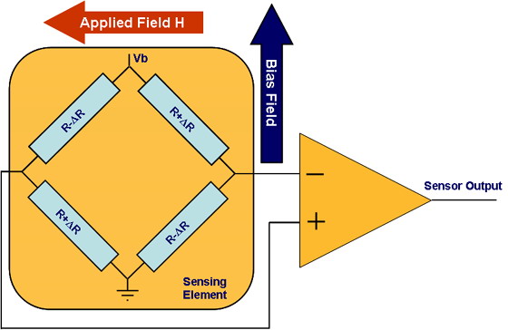 當在一個很薄的鐵條上施加磁力線方向與經過鐵條的電流方向垂直的磁場時,鐵條內的電阻就會發生變化。這種傳感器通常采用單臂電橋形式,如圖所示,電橋由靜態阻值相同的磁阻構成。在測量過程中,電橋上施加電壓Vb,使電流通過電阻。只要磁場H存在,在兩組四個相反放置的電阻器中,第一組兩個電阻的磁化矢量轉向電流,使電阻值變大;而另兩個電阻的磁化矢量背離電流,使電阻值變小。在線性范圍內,傳感器輸出與所施加的磁場強度成正比。