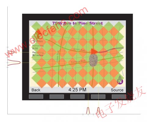 通過比較當(dāng)前基于電阻式觸摸屏和帶手勢識(shí)別的電容式觸摸屏的汽車HMI概念,我們可以發(fā)現(xiàn),新增手勢識(shí)別功能后,駕駛?cè)藛T對路面的關(guān)注程度在某些方面有所改善。通過電容式觸摸屏的手勢識(shí)別不僅是一種新的輸入方式,更使系統(tǒng)輸入提升到了一個(gè)新的層次。采用電容式觸摸屏,駕駛?cè)藛T仍然可以通過點(diǎn)擊瀏覽菜單結(jié)構(gòu),滑動(dòng)手指提高音量或者調(diào)節(jié)HVAC風(fēng)扇速度。不過,真正重要的是其控制標(biāo)準(zhǔn)功能的簡易度,比如控制駕駛過程中非常必要的導(dǎo)航功能。用戶不必緊盯著屏幕,只需一個(gè)簡單的手勢即可實(shí)現(xiàn)縮小操作。屏幕上的任何區(qū)域都可以感知手勢,因此駕駛?cè)藛T不必把手指放在特定的位置來完成操作。圖1顯示就是這種導(dǎo)航屏幕上的動(dòng)作感知說明。