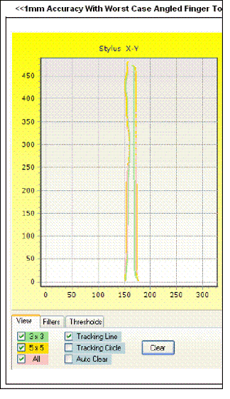 精確度:精確度可定義為,在一個(gè)預(yù)先定義的觸摸屏區(qū)域中最大的定位誤差,以手指的實(shí)際位置與測(cè)量位置之間的直線距離為單位。在測(cè)量精確度時(shí),使用的是一只模擬或機(jī)械手指。手指置于面板上的一個(gè)準(zhǔn)確位置,再把手指實(shí)際位置與測(cè)量位置進(jìn)行比較。精確度非常重要,使用者希望系統(tǒng)能準(zhǔn)確地找到手指位置。電阻式觸摸屏最令人詬病的一項(xiàng)缺點(diǎn),就是低準(zhǔn)確度,而且準(zhǔn)確度會(huì)隨時(shí)間逐漸減弱。電容式觸摸屏的精確度創(chuàng)造出許多新應(yīng)用,例如虛擬鍵盤,以及不用觸控筆的手寫辨識(shí)。圖1顯示一個(gè)結(jié)構(gòu)不完整的觸控面板數(shù)據(jù),顯示手指位置有游移現(xiàn)象,而實(shí)際上模擬手指是進(jìn)行直線移動(dòng)。