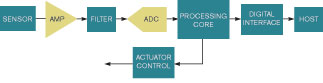 傳感器的模擬信號必須經過數字化才能供系統使用,并且信號要經過放大、濾波和數字化(圖1)。每一級通常都涉及一只圍繞著一些無源元件的器件,以正確地實現一個應用。一旦對信號做了數字化,就可以將其送給微處理器上的控制系統,或整理數據后通過一個通信協議送至一只主處理器。協議可以根據需要使用傳感器數據。