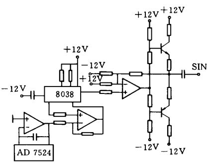 控制器的激勵信號源如圖3 所示。信號由函數信號發生器8038 產生,它能夠輸出正弦波和方波,正弦波用作觸摸屏的激勵信號。單片機通過 8 位 D/ A 轉換器可控制8038 的振蕩頻率,一般控制在200 kHz 左右,以避開計算機顯示器掃描信號產生的干擾。同時,由8038 產生的方波信號提供給模擬解調器,作為解調信號參考源。由于8038輸出的正弦波信號功率有限,為此在8038的正弦波信號輸出端增加了功率放大電路。