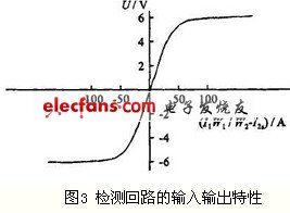 檢測回路的輸入輸出特性見圖3。補償回路開環特性隨著直流磁勢的增加趨于飽和,由于一次被測直流磁勢絕大部分被二次直流磁勢自動平衡掉,剩余磁勢很小,補償回路的開環特性可近似看成一條過原點的直線。以(I1W1/W2-I2s)為橫坐標x,以U為縱坐標y,可得:y=0.14461x。