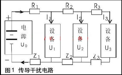傳導干擾主要通過電路的共用導體傳播,典型的結構是共電源線和共地線,圖1是典型傳導干擾電路示意圖。R為電源線上電阻,Z為地線上電阻,U為支路電壓,I為支路電流。