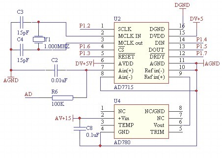 為了實(shí)現(xiàn)對(duì)微壓力的實(shí)時(shí)測(cè)量,使用 16 位的AD7715 對(duì)輸出電壓進(jìn)行采樣測(cè)量,其中AD780 提供2.5V 高精度基準(zhǔn)電壓。P3.1 腳提供了AD 工作所需的時(shí)鐘,P1.4 和P1.5 腳接收和發(fā)送通訊數(shù)據(jù),P1.6 是片選信號(hào),P1.7 接DRDY ,AT89S52 可以通過查詢P1.7 的狀態(tài)來判斷是否可以讀取AD 轉(zhuǎn)換結(jié)果。A/D 接口電路如圖3所示。