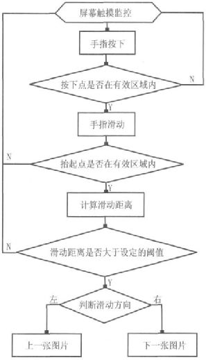 當手指按下時,首先判斷按下點的坐標是否在設定的有效區域內,再判斷抬起點的坐標是否在設定的有效區域內。當手指按下點和抬起點都在有效范圍內時,計算滑動距離,若滑動距離小于設定閾值,當作是無效觸摸,不做任何處理。滑動距離大于設定的閾值且向左滑動,切換為上一張圖片;滑動距離大于設定的閾值且向右滑動,切換為下一張圖片。
