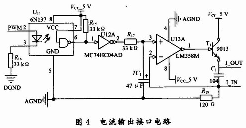 數據處理單元具備一路可控4~20 mA的電流輸出,用于現場指示儀表的驅動。具體的連接電路如圖4所示。其中PWM2連接ARM的PWM2引腳,PWM信號用于控制光耦的導通與截止,反相器主要用于波形的整定,根據磁敏角度和位移關系,建立數學模型,計算出PWM的占空比,從而達到電流大小調節的目的。
