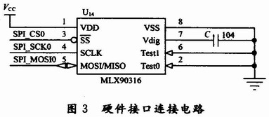 由于串行通信的輸出信號直接來自于MLX90316的內部DSP輸出,SPI輸出模式更穩定,誤差更小,并且具有更高的抗干擾能力。在本設計中,選用SPI接口,具體的硬件接口連接電路如圖3所示。在圖3中,MLX90316的SPI三根線與ARM LPC2136的SPl0口連接。SPI(SerialProtocol InterIace)總線接口是一種同步串行外設接口。這是一個4根信號線的串行接口協議,包括主、從兩種模式。這4根信號線分別是:時鐘線(SCK)、數據輸入線(MISO)、數據輸出線(MOSI)和從設備使能線(SS)。