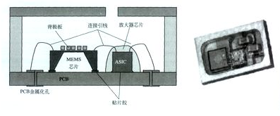 微機電( MEMS)數字傳聲器主要由微機電換能器( MEMS sensor)、內含充電電荷泵的數字傳聲器專用芯片(ASIC)、印刷電路基板(PCB)及屏蔽外殼組成。微機電( MEMS)數字傳聲器原理與封裝結構圖分別如圖5、圖6所示。