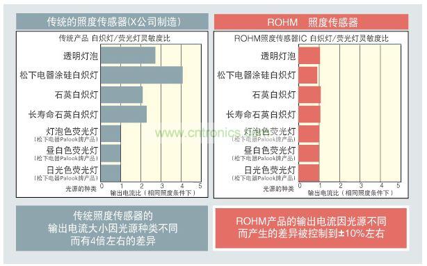 BH1772GLC的照度傳感器具有與人的視覺靈敏度相近的光譜特性,對白熾燈、熒光燈和太陽光等等一切光源均有穩定的靈敏度。所以,在各種環境下的所有應用,使用者均可以簡單操作。