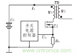 開關(guān)電源從控制方式上可分為電壓控制型和電流控制型,從隔離變壓器的驅(qū)動方式上可分為單端型和雙端型。在這些電路形式中, 許多形式的開關(guān)電源需要使用電流傳感器檢測電流,或者用于脈沖占空比的控制,或者用于電路的保護(hù)。電流控制型開關(guān)電源直接對輸入的脈沖電流進(jìn)行檢測,能同時根據(jù)輸入電壓和輸出電壓的變化綜合調(diào)節(jié)脈沖占空比,具有動態(tài)響應(yīng)速度快,輸入電壓的波動對輸出電壓影響小等特點(diǎn)。電流控制型開關(guān)電源中需要電流傳感器檢測輸入的脈沖電流, 以作為開關(guān)電源調(diào)節(jié)脈沖占空比、穩(wěn)定輸出電壓的反饋信號。圖1 所示為一個電流控制型的反激式開關(guān)電源的輸入通道原理圖。圖中電阻RS在電路中的作用即是電流傳感器, 在功率開關(guān)T1導(dǎo)通時, 流過隔離變壓器原邊繞組W1的電流Ii將使RS上產(chǎn)生電壓降US,US即為向開關(guān)電源控制器反饋的輸入電流值信號。根據(jù)輸出電壓反饋信號和輸入電流值反饋信號US, 開關(guān)電源控制器將綜合調(diào)節(jié)電路的脈沖占空比,保證輸出電壓的穩(wěn)定。