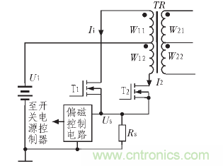 雙端型開關(guān)電源雙向驅(qū)動隔離變壓器,可以有效地提高隔離變壓器的使用效率,減小隔離變壓器的體積。為了防止隔離變壓器偏磁飽和,雙端型開關(guān)電源常常需要電流傳感器檢測輸入隔離變壓器的雙向脈沖電流,以進(jìn)行電流的平衡控制和電路保護(hù)。圖2 為一個推挽式開關(guān)電源的防偏磁原理圖,電路以電阻RS作為電流傳感器,當(dāng)功率開關(guān)T1、T2依次導(dǎo)通時,分別流過隔離變壓器原邊繞組W1和W2的電流I1和I2將被電阻RS以電壓US的形式向偏磁控制電路反饋。一旦兩路電流差值過大或某一路電流值過大,即說明隔離變壓器出現(xiàn)了偏磁飽和現(xiàn)象,由偏磁控制電路調(diào)節(jié)功率開關(guān)T1或T2的導(dǎo)通占空比,使隔離變壓器的雙向磁感應(yīng)強(qiáng)度趨于平衡[2]。