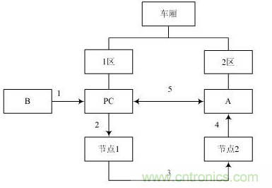 系統設計方案非常簡單。一般來講火車車廂全長26.6 m ,而無線傳感器網絡(wireless sensor net2works ,WSN)的通信距離在幾十米到幾百米之間,一般為30 m ,因此一個節點就可以完全覆蓋整個車廂。在系統中只有2個節點(不需PC協助) :節點1作為發信者,節點2作為收信者,組成最簡單的網絡,不需跳轉。系統的結構簡單,使得傳輸時延非常小,比較適合應用在上文中提到的場合。