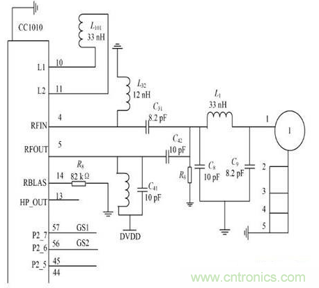 圖中, C31為輸入匹配電容, L32為輸入匹配電感,同時L32還用于阻止直流偏置信號的輸入; C41、C42和L41共同實現發射輸出電路的匹配。通過CC1010內部的發射/接收開關電路,使得收發器通過同一個50Ω的天線進行發射/接收操作。L1 , C8和C9組成一個低通濾波器,用以濾除高頻諧波,并且增加了頻率的選擇性,其阻抗為50Ω。元器件參數既可以按照CC1010datasheet上所給的值,也可利用SmartRF Studio軟件得到。