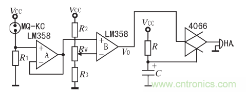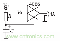 圖1所示的基本報警電路的不足:一開始加電時,傳感器尚未達到穩態,其電阻值較小,VR1較大,導致蜂鳴器HA誤報警。為了解決這一問題,采用一個數字信號控制的模擬開關,其控制信號采用簡單的電容充電延時電路,原理圖如圖2所示。圖1中比較器B的輸出V0加到模擬開關4066的輸入端,開關的輸出端接蜂鳴器HA。初始加電時,電容C上的電壓VC為0,4066不導通,無論V0值為多高,HA都不會報警。隨著電容充電,VC不斷升高,當達到4066的控制門限閾值時,4066才導通,即能進入報警狀態。電容充電使其電壓達到4066的控制門限閾值時間即為延時時間。電容C和電阻R的取值可根據延時要求確定。為可靠起見,取RC=1/2T,T為傳感器初始穩定時間。本裝置取R=l MΩ,C=100μF,即能實現可靠的延時。