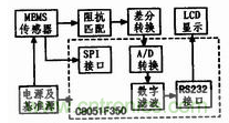 設計中采用C8051F350的24位Sigma-Delta模/數(shù)轉換器作系統(tǒng)信號的模數(shù)轉換,SPI接口作MEMS傾角傳感器的溫度采集,以實現(xiàn)對傳感器的溫度補償,UART作串行LED顯示接口。為保證模/數(shù)轉換器工作穩(wěn)定,采用外部基準源。