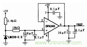 MEMS傾角傳感器SCA100T在傾角為0°時,模擬輸出為其電源電壓的1/2倍,如果傾角傳感器電源電壓有波動,則其輸出會產(chǎn)生相應的波 動。因此設計時,將給模數(shù)轉換電路提供基準源的輸出(如圖4所示),經(jīng)過提高驅動能力后,提供給MEMS傾角傳感器SCA100T作電源(如圖5所示)。 一方面,基準源輸出紋波極小,且性能穩(wěn)定;另一方面,模數(shù)轉換器的基準源和MEMS傾角傳感器SCA100T的電源同時向相同方向變化,抵消了MEMS傾 角傳感器因電源引起零點漂移的影響。