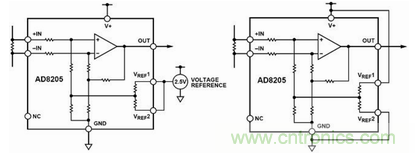 雙極性輸出時AD8205可以測量流過采樣電阻上的雙向電流,這時,輸出可以偏置到輸出范圍內(nèi)的任意位置。當(dāng)被檢測的正反兩個方向上的電流為等幅時,其輸出必須偏置到滿量程輸出的中間位置。當(dāng)雙向電流幅值不對稱時,輸出偏置可以對應(yīng)地偏離半量程位置。它的兩個參考輸入VREF1和VREF2分別連接一個內(nèi)部電阻RREF后接到同一個內(nèi)部偏置節(jié)點,這兩個參考輸入端的操作方式完全相同。在兩個參考電壓輸入端接入對應(yīng)的電壓,即可完成對輸出的偏置。在雙極性輸出方式下,一般有以下兩種連接方式。