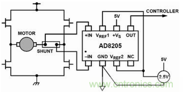 AD8205在H橋馬達(dá)控制電路中作為控制回路的一部分,馬達(dá)和采樣電阻串連后放置在H橋的中間,通過檢測采樣電阻上的電壓,可以準(zhǔn)確地測量馬達(dá)當(dāng)前的電流及其方向。此時,AD8205的輸出被設(shè)定成外部參考雙向的方式,這樣它可以測量H橋開關(guān)的雙向電流并同時監(jiān)測馬達(dá)的運轉(zhuǎn)方向。由于地不是一個特別穩(wěn)定的參考電平,以地為參考將會導(dǎo)致測量的不準(zhǔn)確性。因此,這種測試方案要比以地作為參考電平的測試方法好的多。