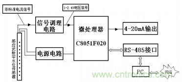 信號調理電路是將傳感器輸出的非標準電流信號轉化為電壓信號,為C8051F020模數轉換做準備。經過單片機模數轉換后,可以將傳感器信號轉化為數字信號,然后就可以很方便地進行下面的操作:存儲水文數據、通過AD421輸出4~20 mA的標準電流信號、RS-485接口輸出等。