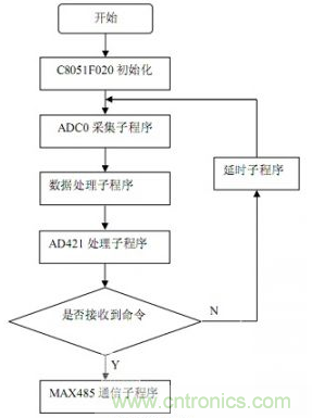 本系統采用C8051F020單片機為核心處理器件,把經過調理電路處理的感應式數字傳感器的電流信號經模數轉換數字化,存入單片機內部存儲器,并轉化為16位的數字信號,一路送AD421轉化為4~20 mA標準電流信號,進行傳輸或控制;另外一路通過MAX485,在上位機查詢命令到達的時候發送上位機,實現實時的監控。本傳感器變送器系統軟件包括以下幾個部分:主程序、AD采集子程序、數據處理子程序、AD421轉化子程序、MAX485通信子程序,另外,根據需要可以加入報警子程序和其他的輔助程序等。整個系統如圖5所示。