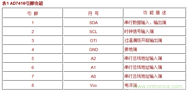 AD7416采用8腳表面貼SO和8腳小型SOIC封裝形式,圖1所示為AD7416的引腳排列圖,各引腳功能如表1所列。