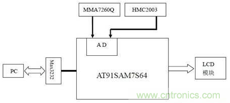 本系統(tǒng)的硬件結構如圖2所示。由于At91sam7s64具有片上A/D轉換器而且具有8選1模擬復用器,使得MMA7620Q和HMC2003可以直接與微控制器相連而不必外加A/D轉換器和復用器,不僅降低了系統(tǒng)的成本和體積,提高了系統(tǒng)的集成度,同時減少了誤差源,提高了精度。經(jīng)過A/D轉換的測量數(shù)據(jù)經(jīng)過ARM核的處理后,被送到串口LCD并通過RS232接口送入PC機進行進一步的分析。
