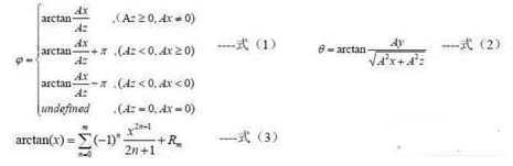 為了獲得系統(tǒng)基于重力向量的俯仰角θ和橫滾角φ,需要使用加速度計的三個輸出:Ax, Ay, Az.俯仰角和橫滾角可以通過以下公式(1)和公式(2)計算得到。對于微控制器,函數(shù)中的arctan(x)需要通過以下公式(3)的泰勒展開后才能計算得到。
