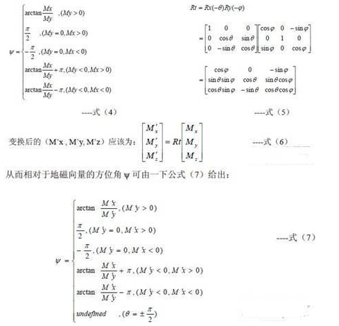 為了獲得系統(tǒng)相對于當?shù)氐卮畔蛄康姆轿唤牵枰褂肕R傳感器的三個輸出Mx, My, Mz.當系統(tǒng)置于水平狀態(tài)時(俯仰角和橫滾角都為0)時,方位角ψ可以由公式(4)直接給出,但是在大多數(shù)情況下,系統(tǒng)并不是工作在水平狀態(tài),此時地磁場的豎直分量將會影響Mx和My的值,因此不能直接由公式(4)獲得相對于地磁向量的方位角。為了在所有情況下都能獲得正確的方位角,必須將俯仰角和橫滾角考慮在內,即必須通過以俯仰角和橫滾角為參數(shù)的坐標變換,將測得的(Mx, My, Mz)向量變換為與載體坐標系有相同方位角的水平坐標系下的向量(M‘x , M’y, M‘z),其變換矩陣如公式(5)。