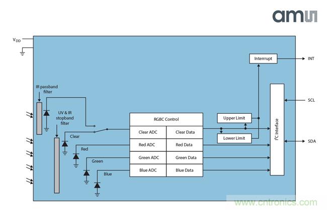 四個獨立的模擬數(shù)字轉(zhuǎn)換器(ADC)分別對應(yīng)一個RGB通道, C通道和紅外線通道共用第四個模擬數(shù)字轉(zhuǎn)換器。四個通道同時取樣能避免快速變化的光照條件下CCT和光照強度的測量出錯。TCS3490傳感器的光電二極管被安排在一個輻射狀結(jié)構(gòu)上,因此光線從任意方向射入都能獲得一致的有效響應(yīng),尤其是從圓形的窗口中射入的光。當(dāng)光線測量值或顏色測量值超過預(yù)設(shè)的閾值時,傳感器會向處理器發(fā)送中斷信號,避免處理器不停地通過I2C接口輪詢,幫助降低整個系統(tǒng)的功耗,延長電池壽命。