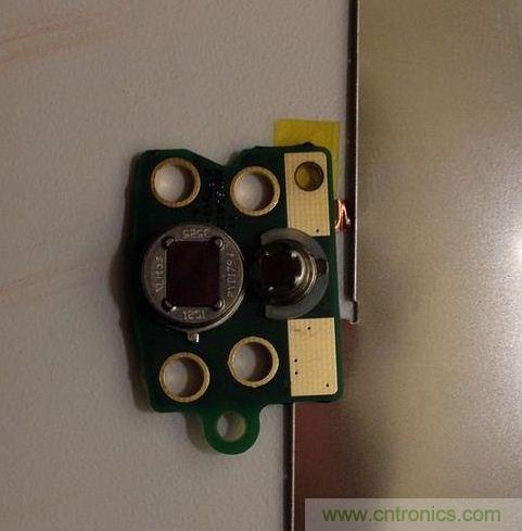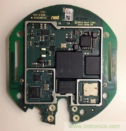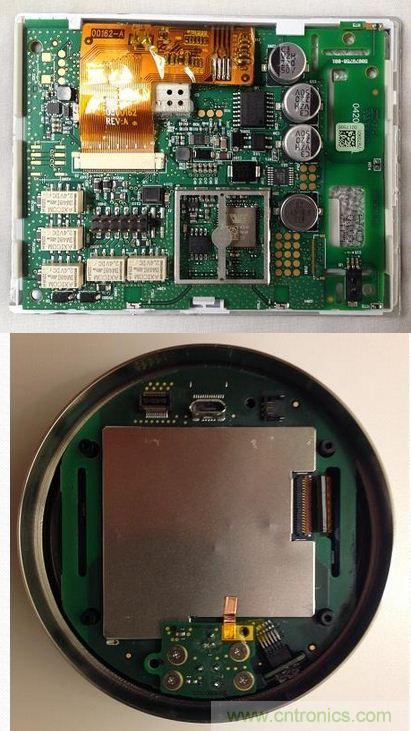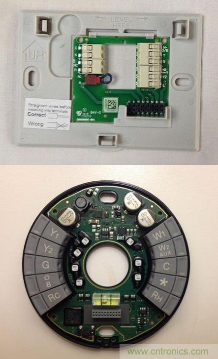 霍尼韋爾恒溫器的單個PCB上包括多個DC-DC轉換器、穩壓器和整流器、一個8通道12位ADC、128MB SDRAM、32M閃存和博通(Broadcom)Wi-Fi模塊(屏蔽罩移除)。主處理器是愛特梅爾(Atmel)926 ARM處理器,外面包覆了金屬屏蔽罩,僅在扁平帶狀電纜至顯示器下方可見。Nest恒溫器的主要電子元器件全部被包覆在單個屏蔽罩下。靠近底部的兩個附加電路提供檢測功能。PCB與顯示器通過螺絲固定,金屬環被卡在兩者之間,但可以自由旋轉。