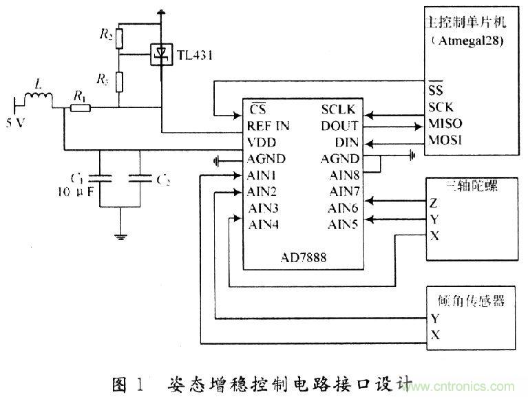 無人機(jī)內(nèi)回路控制作為外回路控制的基礎(chǔ),對(duì)其能否穩(wěn)定飛行起著至關(guān)重要的作用。該系統(tǒng)中,內(nèi)回路是由三軸陀螺和傾角傳感器構(gòu)成的姿態(tài)增穩(wěn)控制回路。主要由主控制單片機(jī)、A/D采樣芯片、三軸陀螺儀和傾角傳感器組成。主控制單片機(jī)通過SPI串行總線與A/D采樣芯片相連,通過A/D采樣芯片獲得三軸陀螺儀的角速率與傾角傳感器的橫滾角和俯仰角,然后進(jìn)行姿態(tài)信息融合,得到無人機(jī)俯仰和橫滾的姿態(tài)信息。主要接口連接情況如圖1所示。