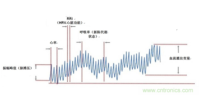 光學心率傳感器可生成測量心率的PPG波形并將該心率數據作為基礎生物計量值,但是利用PPG波形可以測量的對象遠不止于此。盡管很難取得和維護精確的PPG測量結果(我們將在下一篇詳細論述它),但是如果您能夠成功獲得精確的PPG測量結果,它將發揮強大的作用。高品質PPG信號是當今市場需求的大量生物計量的基礎。圖2是經過簡化的PPG信號,該信號代表了多個生物計量的測量結果。