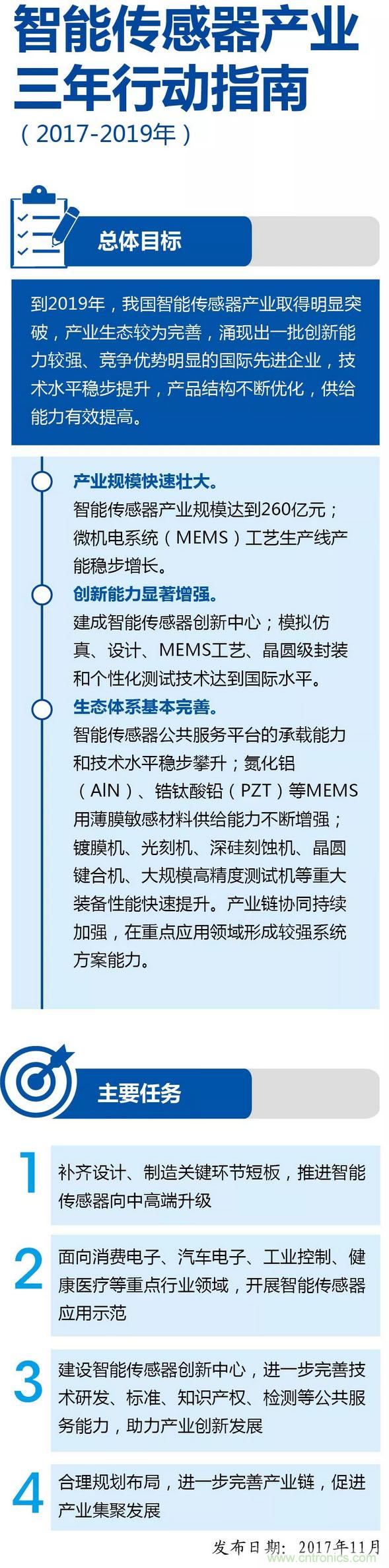 2017年,工信部發布了《智能傳感器產業三年行動指南(2017-2019年)》,提出了要在智能終端、物聯網、汽車電子等工業領域有所發展。據有關專家預計2019年中國的智能傳感器產值將達到35億美元,國產智能傳感器所占比重將達到25%以上,比之前比重提高一倍。