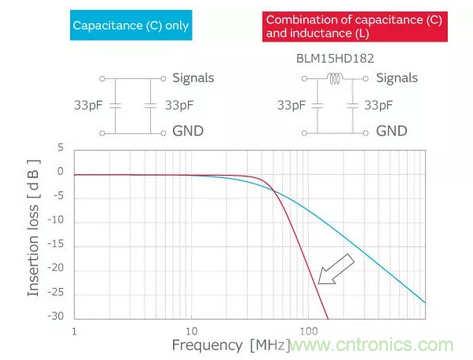噪聲級別小或信號和噪聲的頻率相差大的情況下,可以只用電容器進(jìn)行降噪,但如果信號頻率和噪聲頻率相近時,需要電感器和電容器組合來構(gòu)成插入損耗陡峭的濾波器。