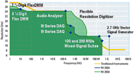 基本上,虛擬儀器系統(tǒng)是基于軟件的,所以如果只要是可以數(shù)字化的東西,就可以對它進行測量。因此,測量硬件可在通過兩根坐標(biāo)軸進行評估,即分辨率(位)和頻率。參考下圖可以看出虛擬儀器硬件測量性能與傳統(tǒng)儀器的比較。NI的目標(biāo)就是將曲線在頻率和分辨率上延伸并且在曲線內(nèi)進行不斷推陳出新。