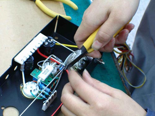 (4)用鑷子轉動引線,確認不松動,然后可用偏口鉗剪去多余的引線。