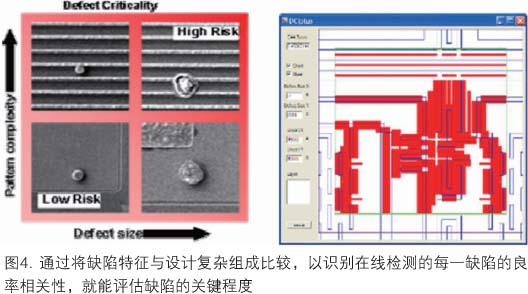 為了提高監(jiān)測和識別關鍵缺陷的效率,必須采用新方法。依賴簡單的缺陷過濾和基于大小的缺陷次序是不夠的。為了取得最佳的檢測和鑒評預算,必須對檢測設置與鑒評策略二者使用新的知識信息。從設計和模擬得到的關鍵區(qū)域和熱點這樣一些知識信息可以插入檢測方略中,優(yōu)化可用的檢測容量。在完成檢測過程中和完成后,基于多重檢測結果的缺陷過濾和分類使用戶能快速識別新缺陷,有效地量化已知的缺陷類型。利用設計空間中缺陷鄰近位置的信息(此處,設計的復雜組成是了解的),可以較好地評估每一缺陷的良率相關性,提供缺陷的排序(圖4)。