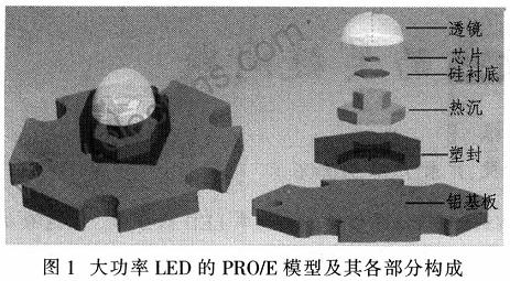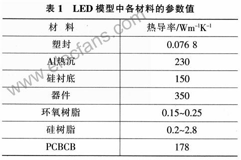 討論在現(xiàn)有結(jié)構(gòu)、LED封裝及熱沉材料熱導(dǎo)率等因素變化對于其最大功率的影響,尋找影響LED散熱的關(guān)鍵因素。研究方法為有限元熱分析法.該方法已有實驗驗證了LED有限元模型與其真實器件之間的差別,證明其在誤差許可范圍內(nèi)是準(zhǔn)確可行的。