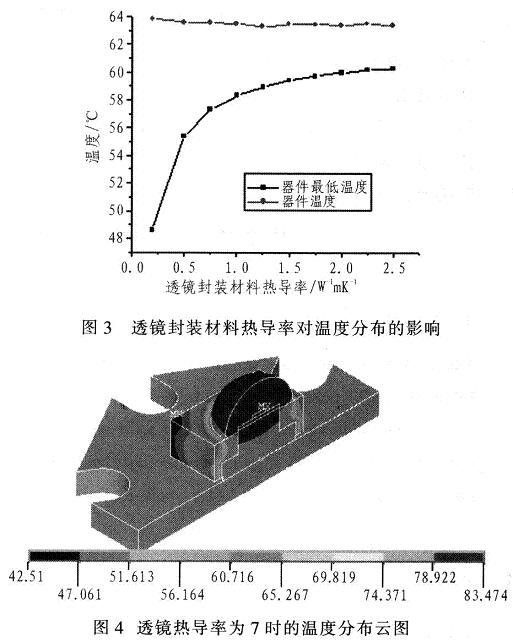 只考慮熱傳導(dǎo)與對流,改變不同封裝填充材料如硅樹脂.得出結(jié)果,如圖3所示。即使找到一種熱導(dǎo)率高達(dá)7Wm-1K-1的環(huán)氧樹脂成分封裝材料時,相比使用熱導(dǎo)率為0.25Wm-1K-1的環(huán)氧樹脂成分封裝材料時,芯片溫度下降不多,鋁基板溫度只下降了2.271℃,最大功率僅提高了0.69W。實際上,熱導(dǎo)率值超過7Wm-1K-1以上、可商業(yè)化的透明硅樹脂封裝材料目前尚無文獻(xiàn)報導(dǎo)。分布云圖如圖4所示。