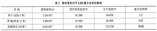 表3為3種不同散熱方式對LED的溫度分布、最大功率的影響??梢钥闯觯黾由崦娣e是很好的散熱方式,可以輕易地提高LED器件散熱能力,這是目前LED產(chǎn)品所普遍使用的散熱方式之一。然而缺點也很明顯:影響成本、增加產(chǎn)品重量、影響封裝密度。無限度地提高LED散熱片面積顯然不現(xiàn)實,因此一般使用1.5inch2散熱片提升LED產(chǎn)品最大功率至10W左右,出于成本等因素就不能繼續(xù)提高。