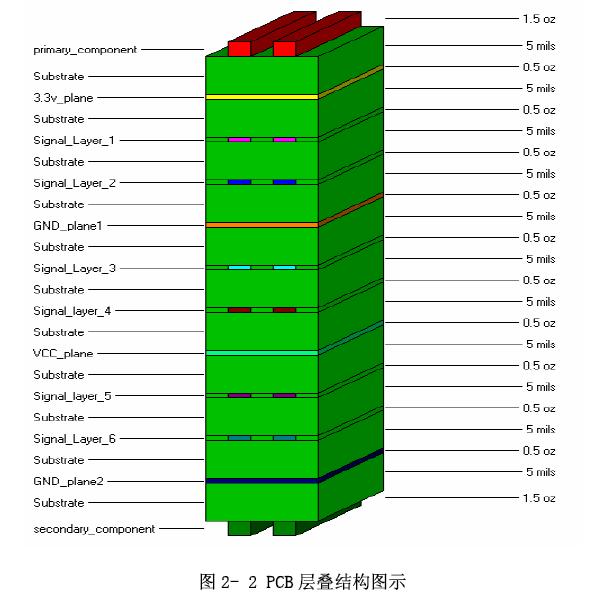 綜合以上三點,最后采用12層印制板,其中8個信號層(包括元件層),兩個地層,一個3.3V電源層,一個混合電源層(包括5V、2V、兩個2.5V)。用HyperLynx軟件優化出來的PCB層疊結構如圖2-2所示,總厚度為65.7mil,即1.67mm,滿足VME64規范要求。